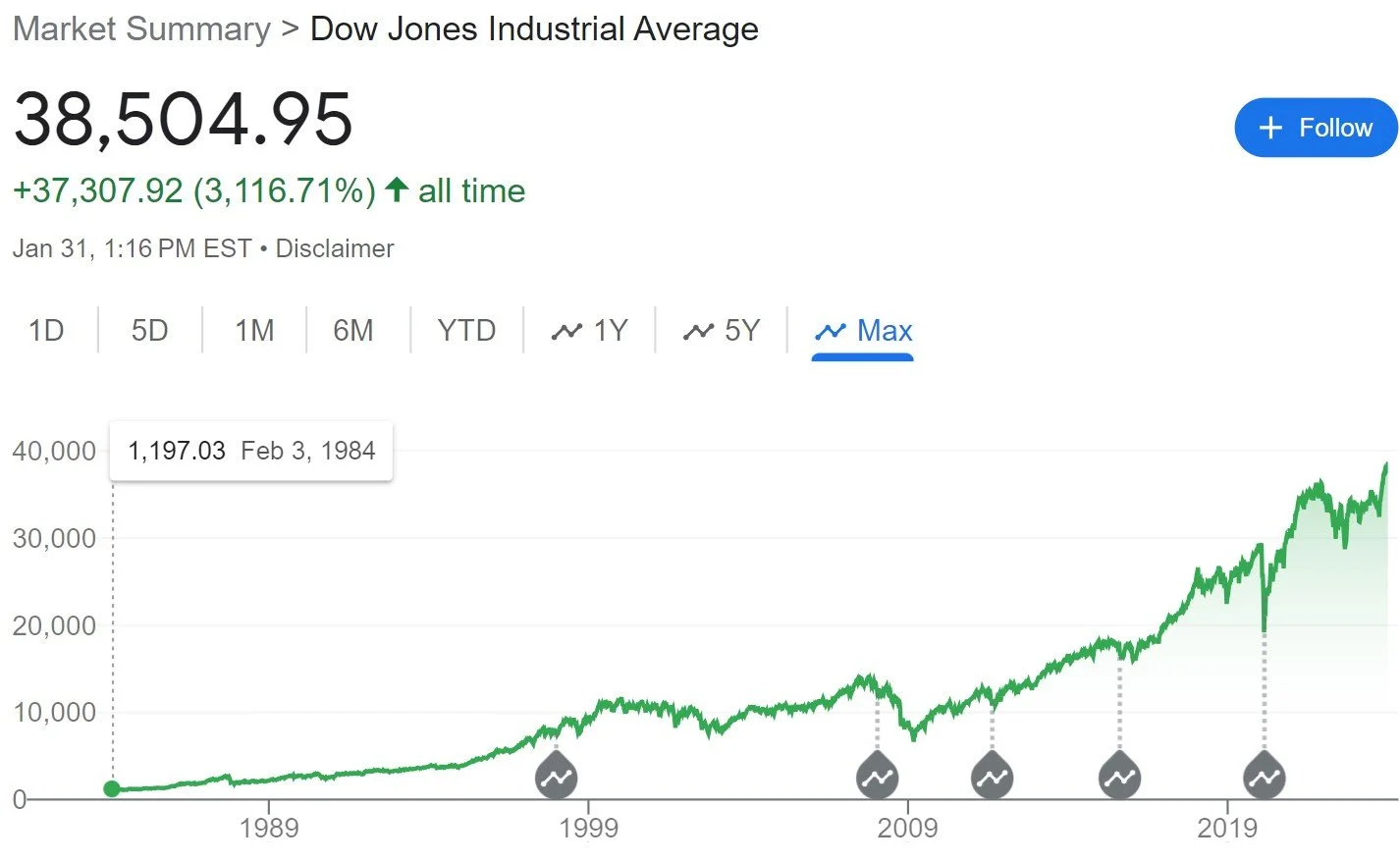 Looking back to the chart at the beginning of this article, remember the feelings we discussed? Dread, fear, panic, and FOMO. They all are designed to help you make quick decisions to survive. Do you suppose Warren Buffett faced these moments? Undoubtedly he did and many more over the course of his long investment career. Now, consider this graph: